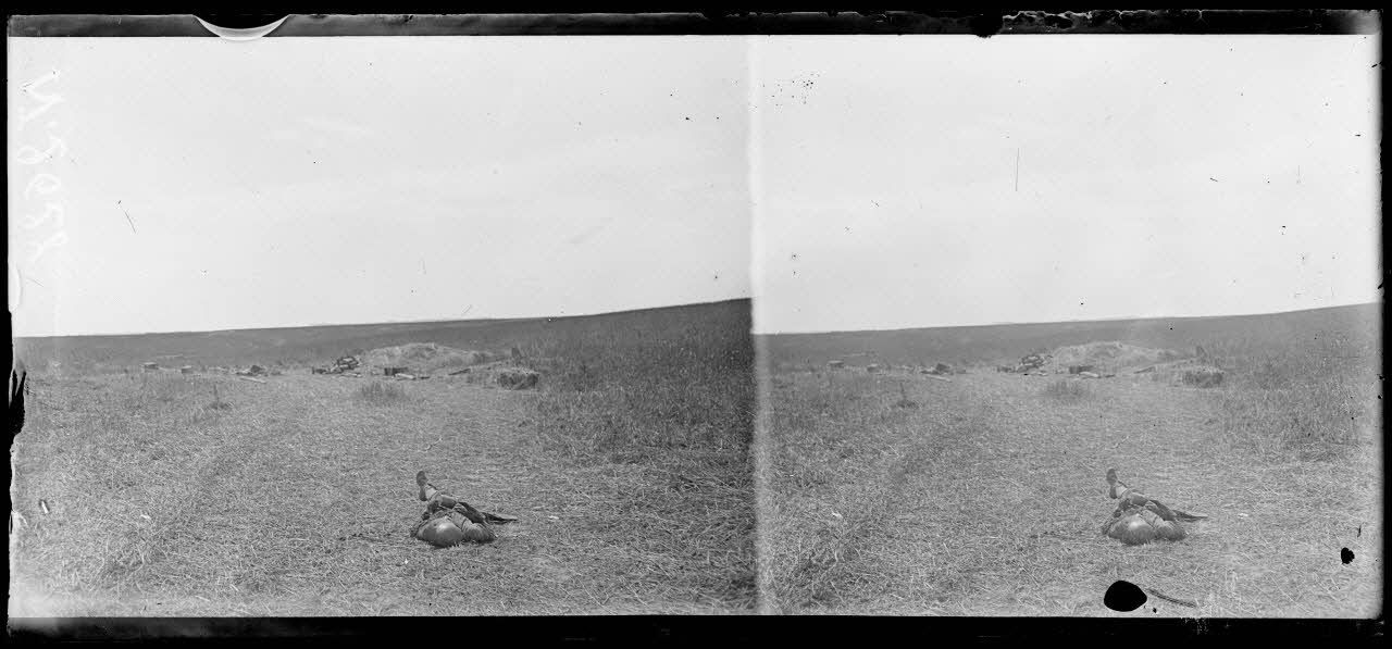 Attaque du 18 juillet 1918. Près de Chaudun (Aisne), cadavre d'un artilleur allemand devant un emplacement de batterie. [légende d'origine]