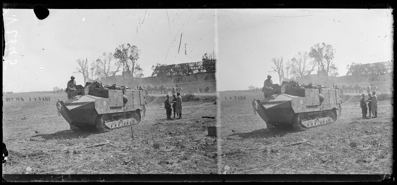 Attaque du 18 juillet 1918. Près de Chaudun (Aisne). Tank revenant du combat et croisant des réserves. [légende d'origine]