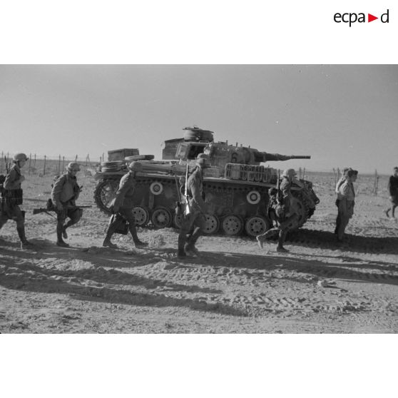 Des soldats du Panzer-Pionier-Bataillon (Pz.Pion.Btl-33) se dirigent vers des Panzer III (Pz-III Ausf-F) du 6-Panzer.Regiment-8 de la 15-Panzer.Division.
