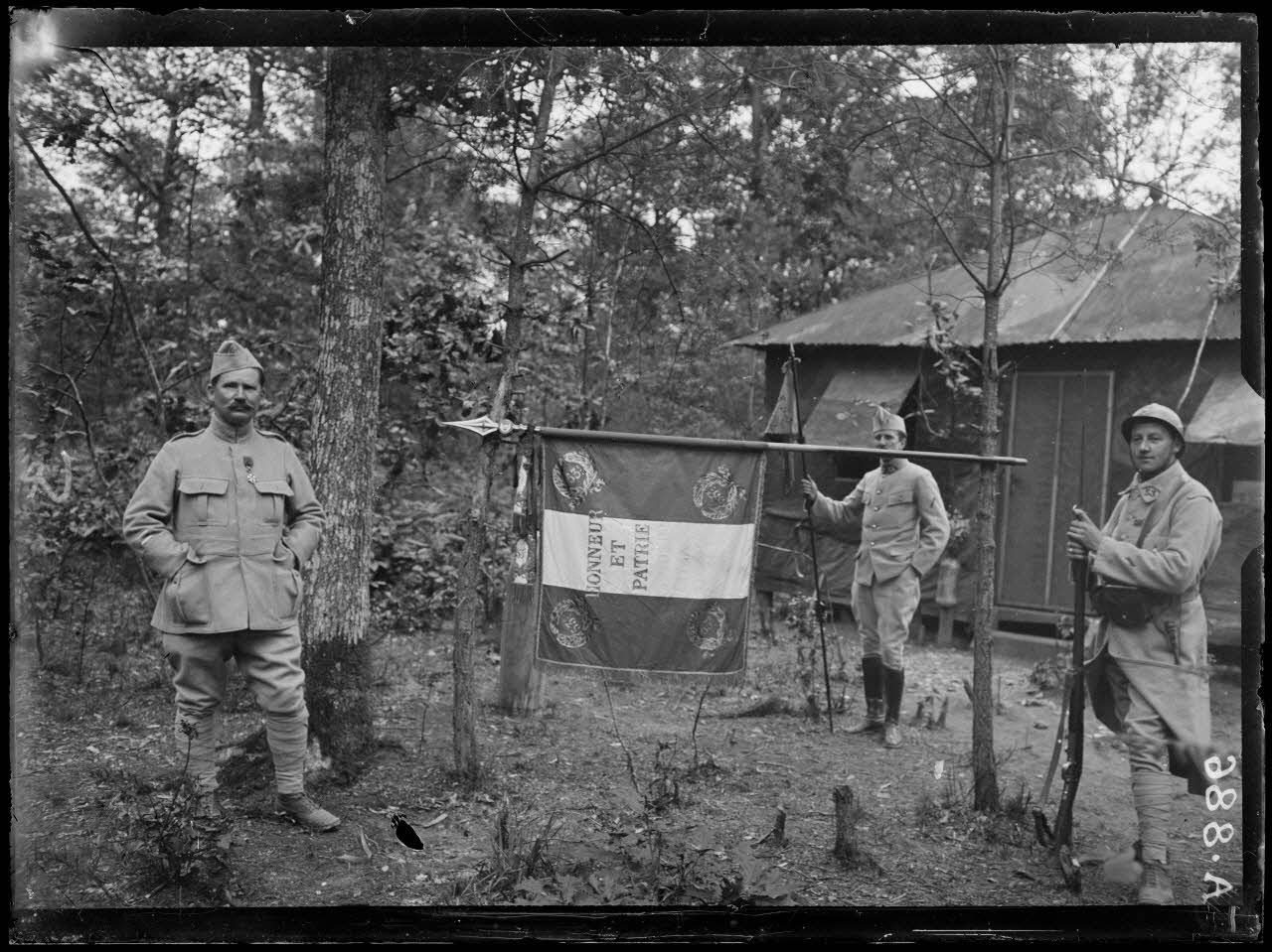 Au bois Allongé. Près Bus. Somme. Le drapeau du 53e colonial. Au 1er plan, Colonel Le Hagre.