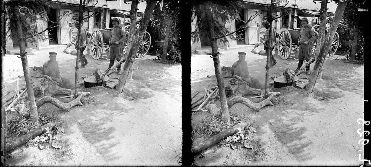 - au camp de Mourmelon : une sentinelle, un groupe d'infirmiers, la cuisine de campagne et ses hommes, des soldats occupés à nettoyer leurs bottes ;