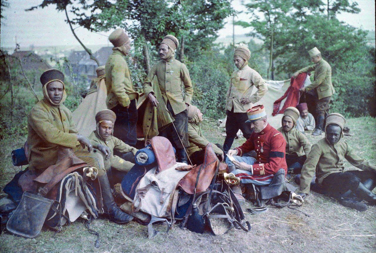 Le titre indiqué pour cette autochrome dans la présente notice est celui du cliché en noir et blanc. Cependant, contrairement à ce que dit la légende originelle, les soldats ne sont pas des goumiers mais des spahis et portent l'uniforme du 4e régiment de marche de spahis algériens (4e RMSA).