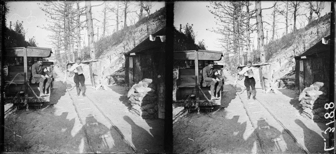Au cavalier de Courcy (Marne). Les abris et le petit chemin de fer le long du canal.