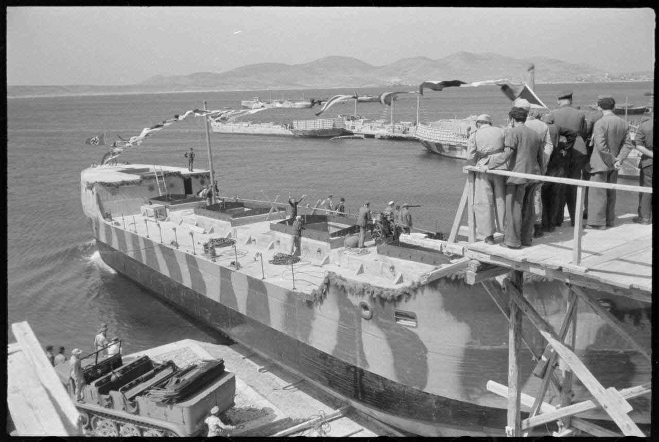 Au chantier naval de Perama (Athènes), l'inauguration d'une péniche pour les besoins de la marine allemande.