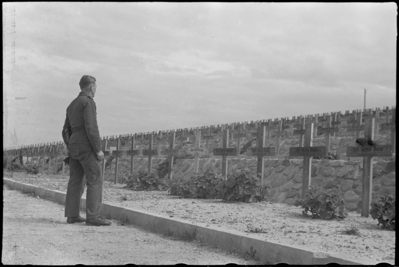 Au cimetière de Maleme (Crète), un caporal de la Luftwaffe se recueille devant des tombes de parachutistes allemandes tombés lors de l'opération Merkur.