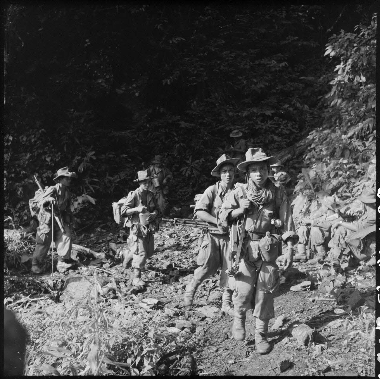 Au cours de leur progression vers Nga Na Son, des chasseurs du 5e bataillon de chasseurs laotiens (BCL) profitent d'une source pour emplir leurs bidons ou se reposer.