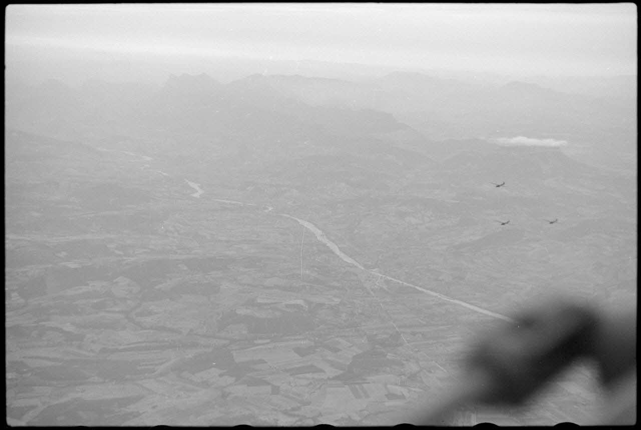 Embarqué dans un avion Henschel Hs-126, le photographe illustre une mission d'entraînement au-dessus de la Drôme. Ici, la queue du Hs-126.