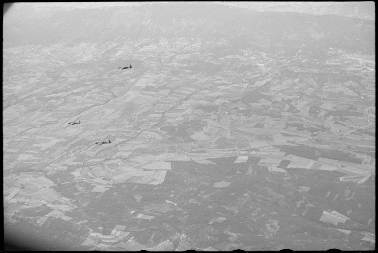 Embarqué dans un avion Henschel Hs-126, le photographe illustre une mission d'entraînement au-dessus de la Drôme. Ici, la queue du Hs-126.