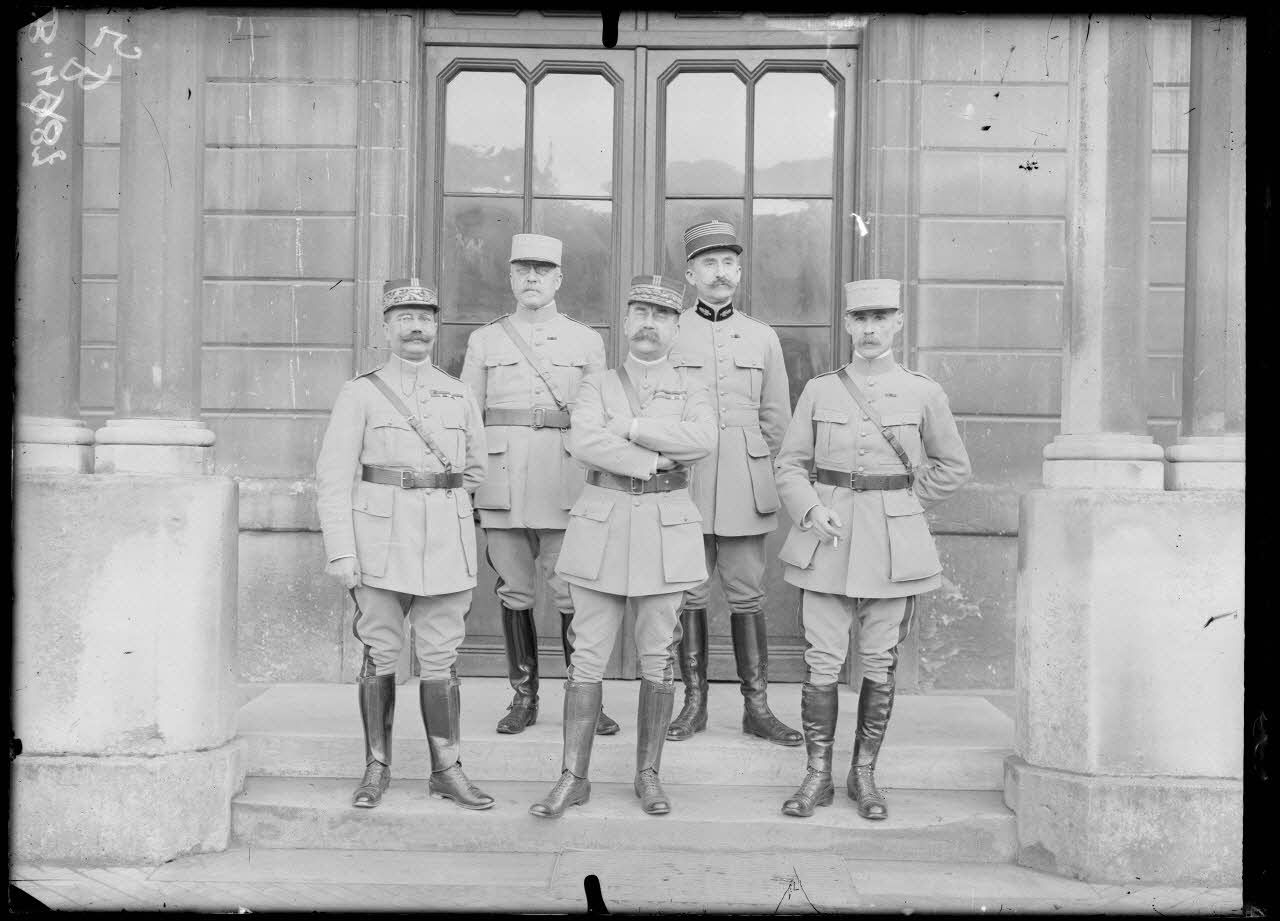 Au GQG, Groupe des majors généraux. De gauche à droite : 1er rang, général Ragueneau, général Pont, général Claudel, 2e rang, général Dupont, colonel Poindron. [légende d’origine]