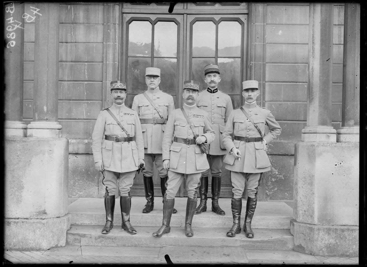 Au GQG, Groupe des majors généraux. De gauche à droite : 1er rang, général Ragueneau, général Pont, général Claudel, 2e rang, général Dupont, colonel Poindron. [légende d’origine]