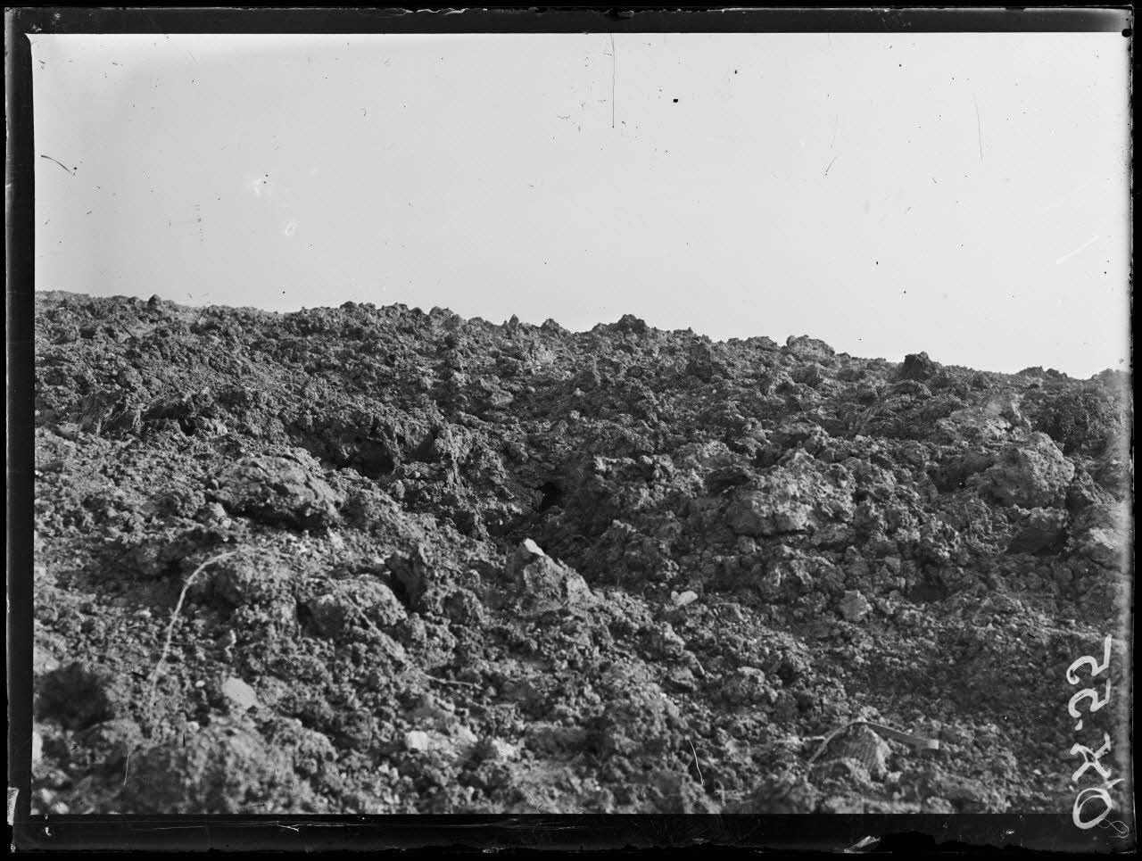 - Paysages dévastés de la crête du Mort-Homme, des trous d'obus parsemment le sol et les terrains sont vierges de toute végétation ;