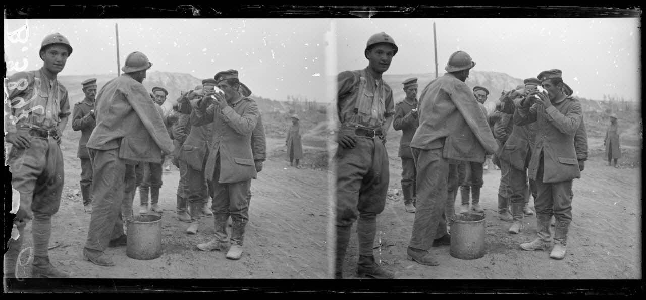 Au moulin de Fargny, ouest de Curlu (Somme), arrivée de prisonniers au bois des Croisettes. Les prisonniers allemands se désaltèrent.
