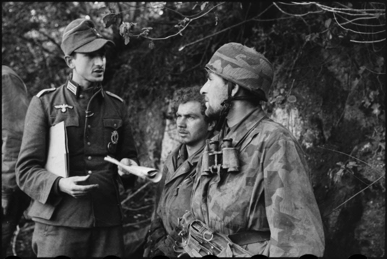 Carte à l'appui, deux parachutistes de la 4.Fallschirmjäger.Division s'entretiennent avec un sous-lieutenant d'infanterie.
