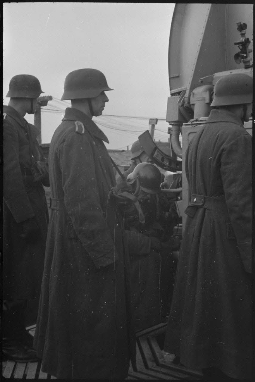 Au sein d'une batterie de 8,8 cm FlaK, les servants d'un télémètre (Kommandogerät 36) apportent leur appui feu à l'aide de fusil Mauser 98k.