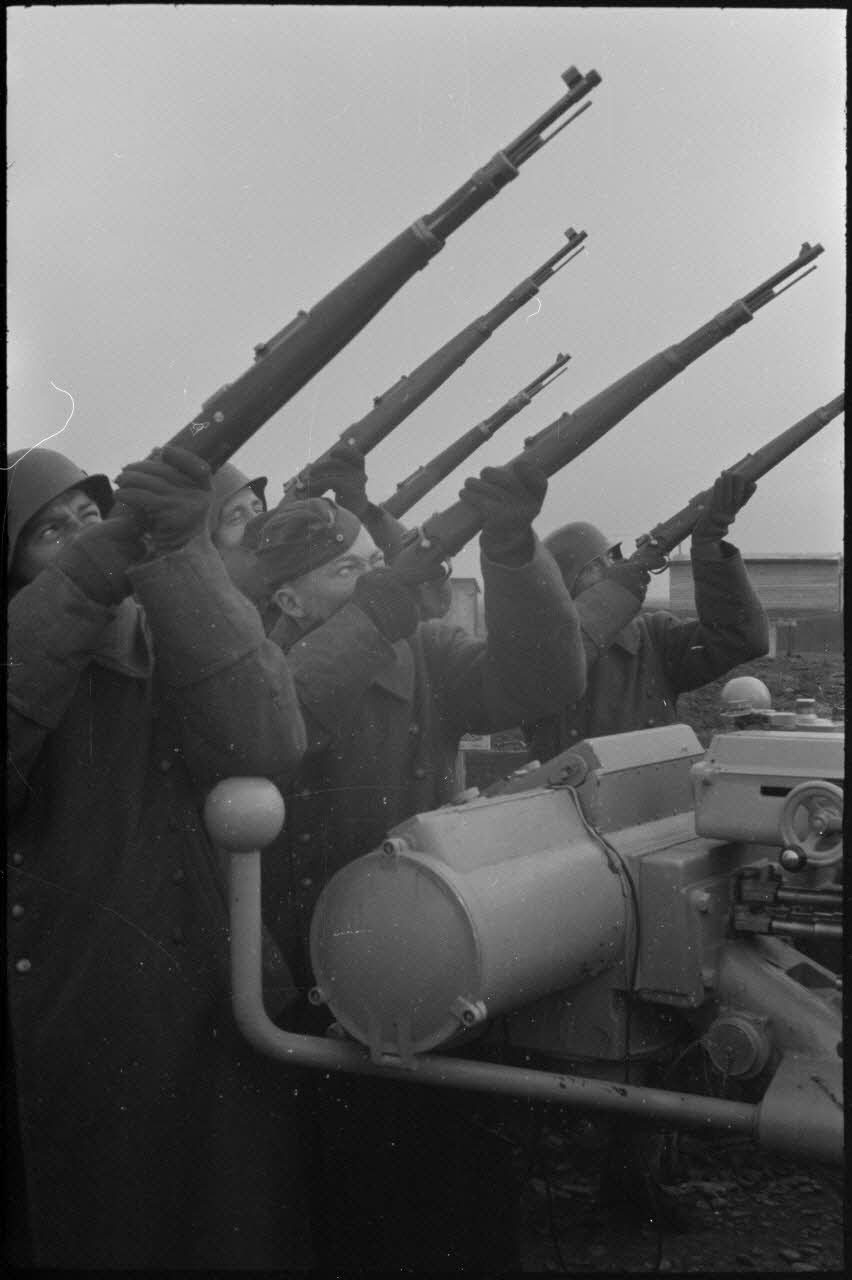 Au sein d'une batterie de 8,8 cm FlaK, les servants d'un télémètre (Kommandogerät 36) apportent leur appui feu à l'aide de fusil Mauser 98k.