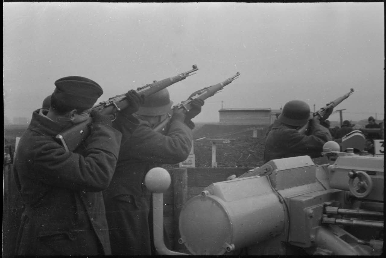 Au sein d'une batterie de 8,8 cm FlaK, les servants d'un télémètre (Kommandogerät 36) apportent leur appui feu à l'aide de fusil Mauser 98k.