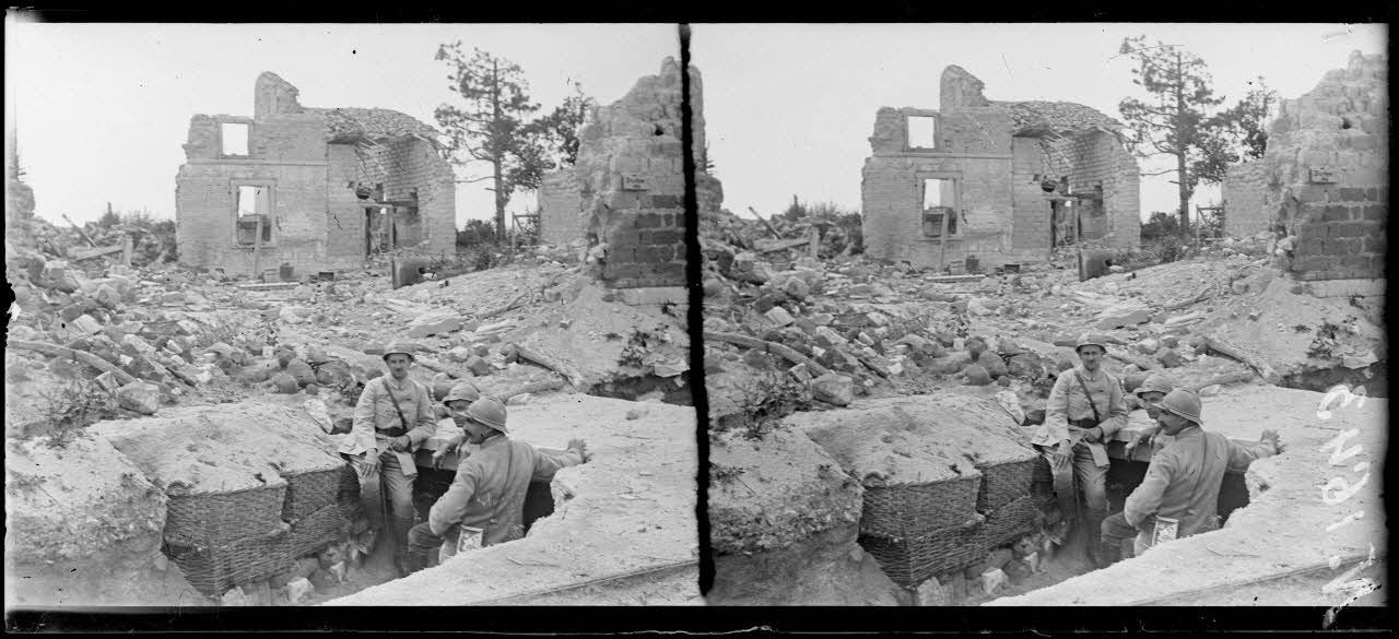 - Dans le secteur de La Harazée, les soldats se reposent entre deux gardes dans les abris construits à flanc de coteau. Au camp Condé, les hommes prennent la soupe. Du fil de fer barbelé est déchargé de camions pour être acheminé vers les réseaux. Un guetteur est installé dans son poste d'observation. Le commandant de la compagnie interroge le chef de section sur l'activité du jour. Dans les tranchées inondées par les pluies, les soldats évacuent l'eau avec une pompe. Des postes d'artillerie de tranchée sont installés à côté des postes d'observation. Des grenadiers voltigeurs du 296e RI (régiment d'infanterie) nettoient leurs armes, notamment le tromblon lance-grenades Vivien Bessières.