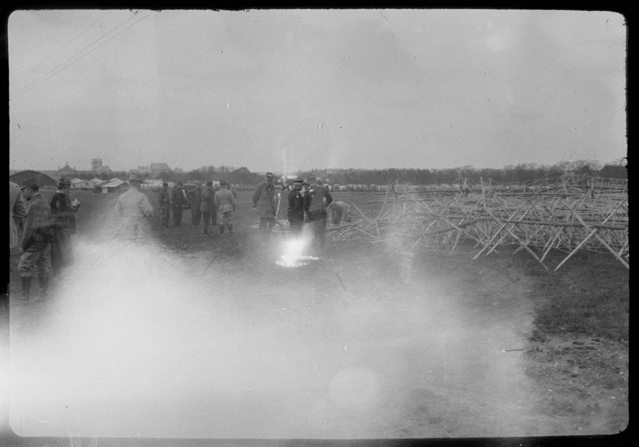 Reportage de négatifs ayant servi au tirage de plusieurs autres plaques de verre et tirage sur papier qui traite des essais du prototype de char Saint-Chamond à Vincennes ainsi que des essais en usine du tracteur modifié appelé "appareil Breton-Pretot". Tous deux témoignent de l'investissement de Jules-Louis Breton dans le développement d'une solution de franchissement des barbelés qui a mené à l'élaboration des chars Schneider et Saint-Chamond.