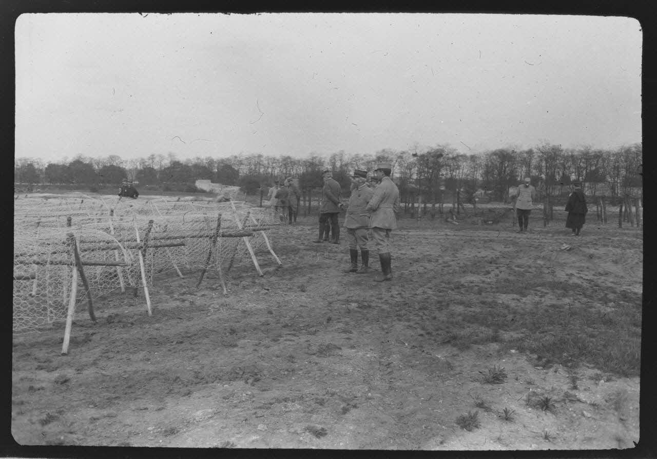 [Autorités militaires devant un réseau de barbelés lors d'une expérimentation à Vincennes, juillet 1916.]