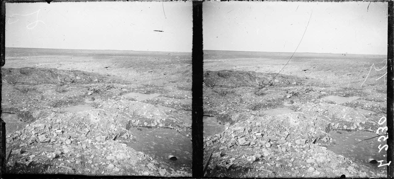 - à Fleury-devant-Douaumont : une batterie de 155 mm (recouverte d'une bâche, SPA 53 L 2523), l'église en ruines au milieu du champ de bataille (SPA 53 L 2525), plan large du champ de bataille (au premier plan un casque Adrian sur une croix marque l'emplacement d'une tombe, autour des douilles d'obus, des pelles et des casques, SPA 53 L 2527), les tranchées au milieu du champ de bataille (SPA 53 L 2528/2530), des soldats sur le champ de bataille (SPA 53 L 2534) ;