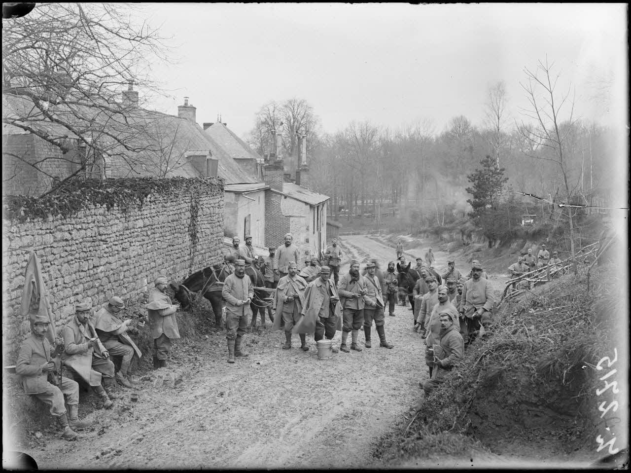Près de la ferme du Goulot (environs de Jonchery-sur-Marne, Marne). Vue d’ensemble du cantonnement. Au 1er plan les territoriaux mangeant la soupe.