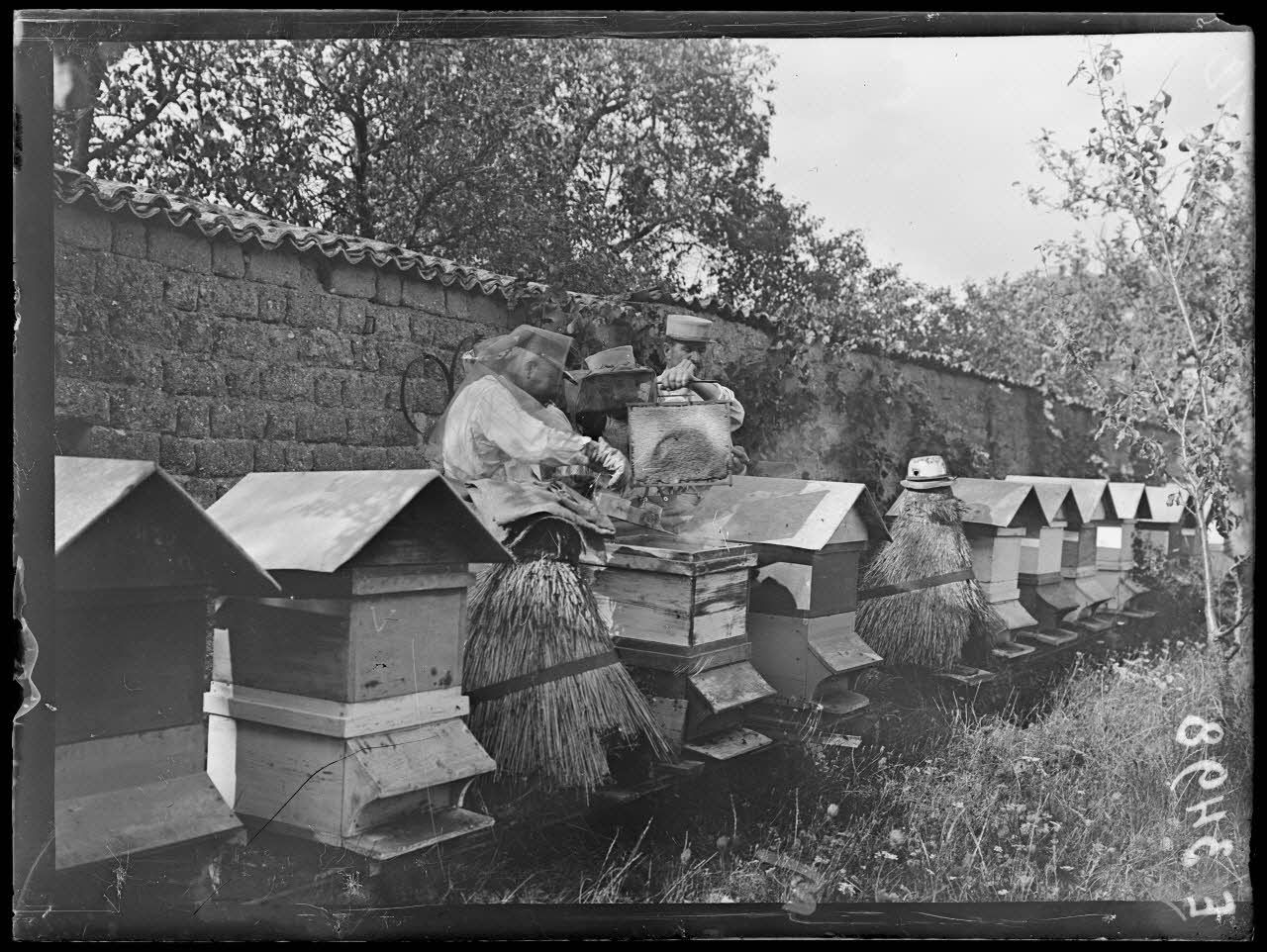 Aux Petites Loges. Marne. Les paysans étant évacués, l'autorité militaire fait procéder à la récolte du miel. [légende d'origine]