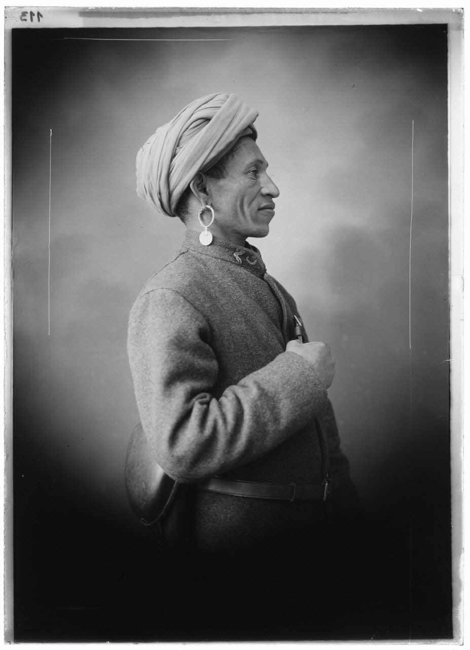 [Auxiliaire d'une ancienne colonie française de profil dans un décor de studio.]