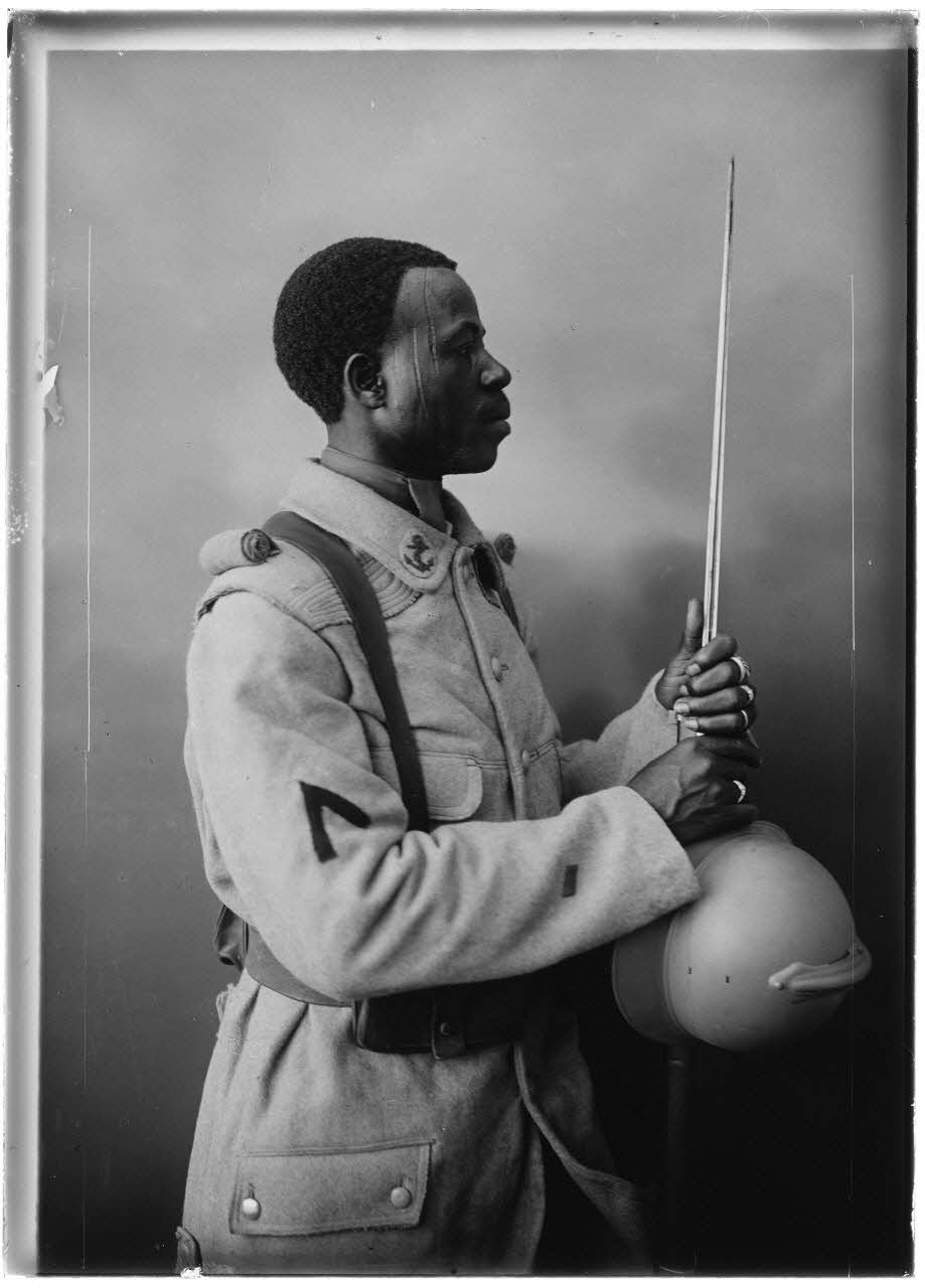 [Auxiliaire d'une ancienne colonie française de profil dans un décor de studio.]
