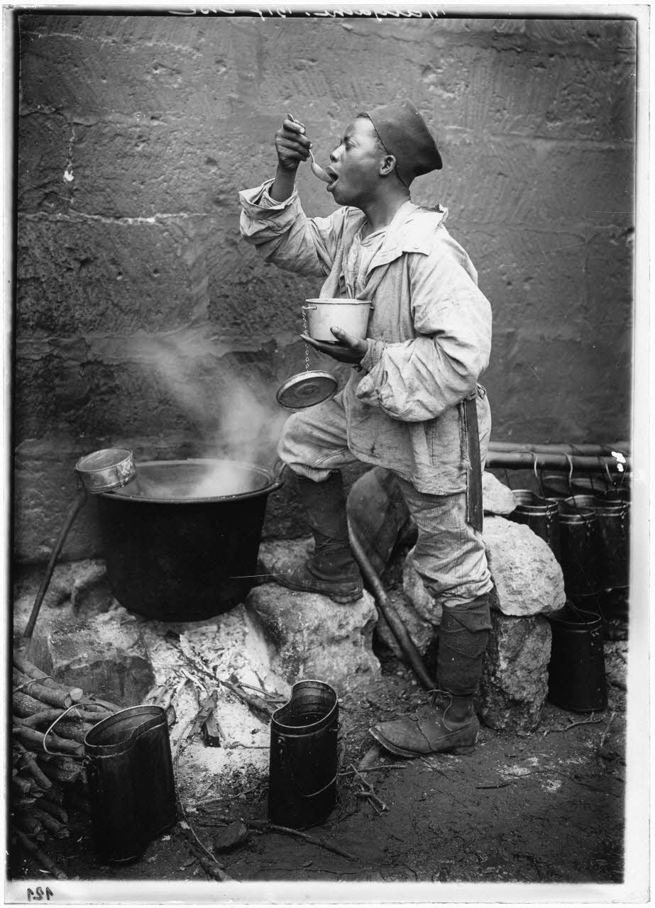 [Auxiliaire d'une ancienne colonie française goûtant la préparation du repas.]