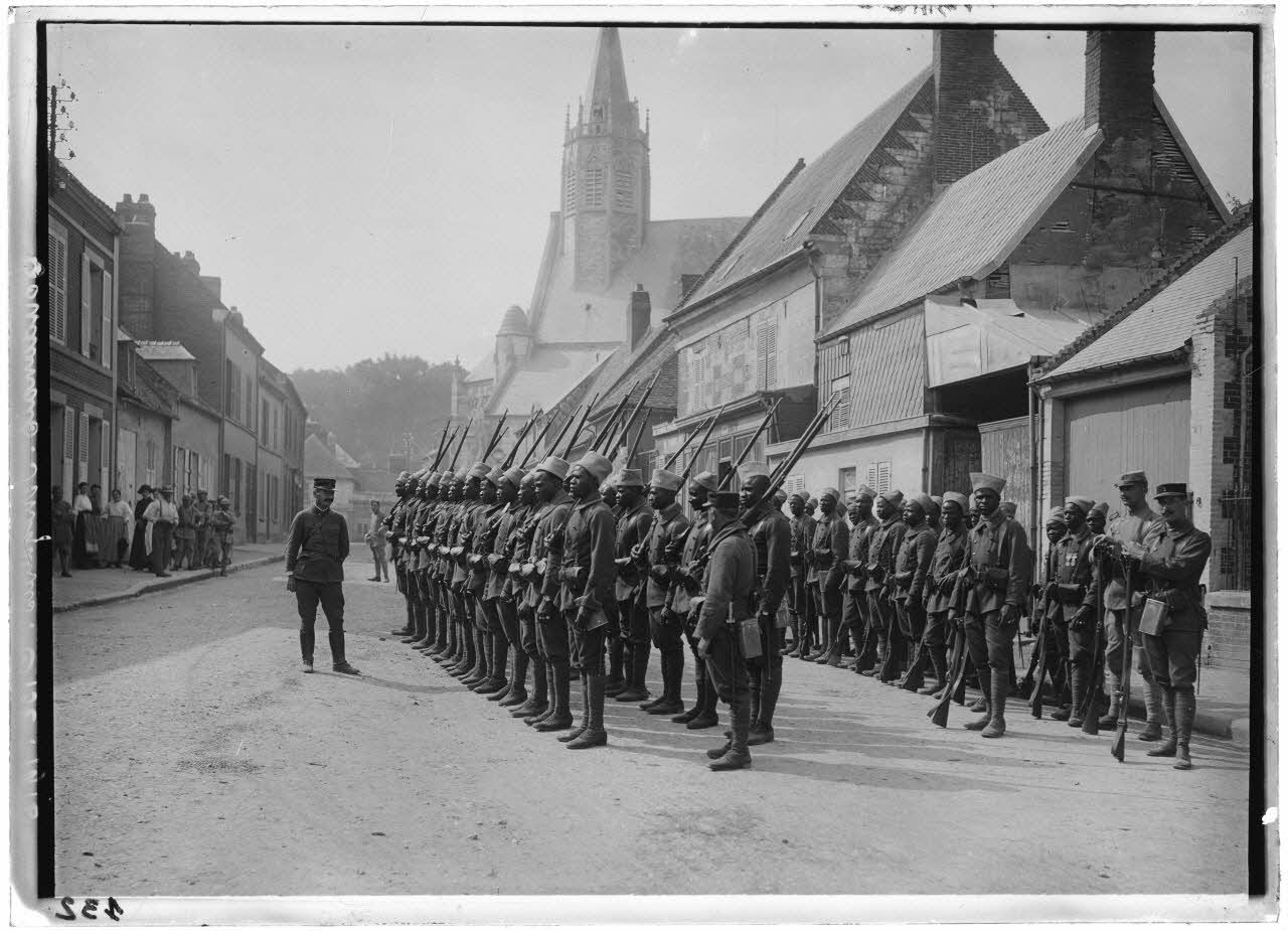 [Auxiliaires d'anciennes colonies françaises alignés au garde-à-vous.]