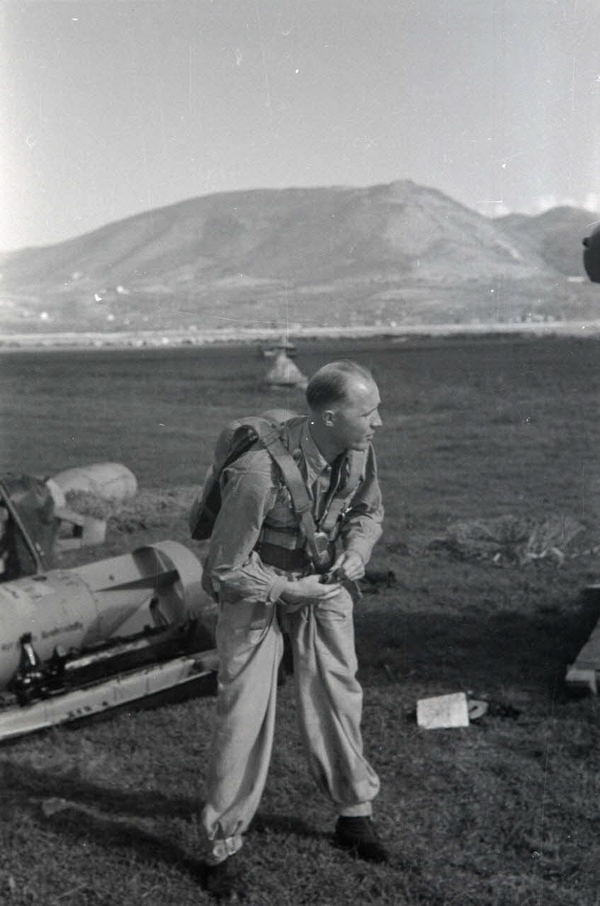 Sous un hangar du terrain de Guidonia Montecelio (Latium), le capitaine (Hauptmann) Gerhard Walther du SG 4 (Schlachtgeschwader 4).