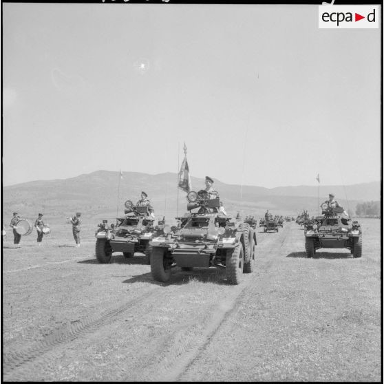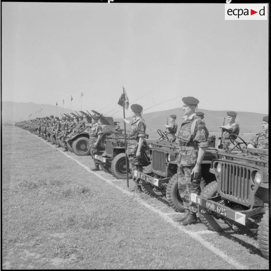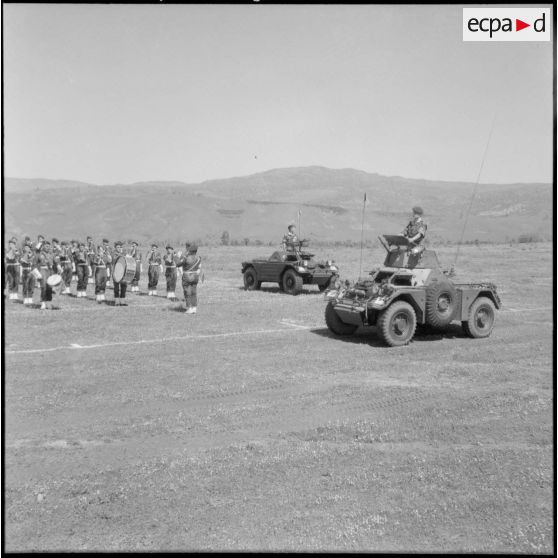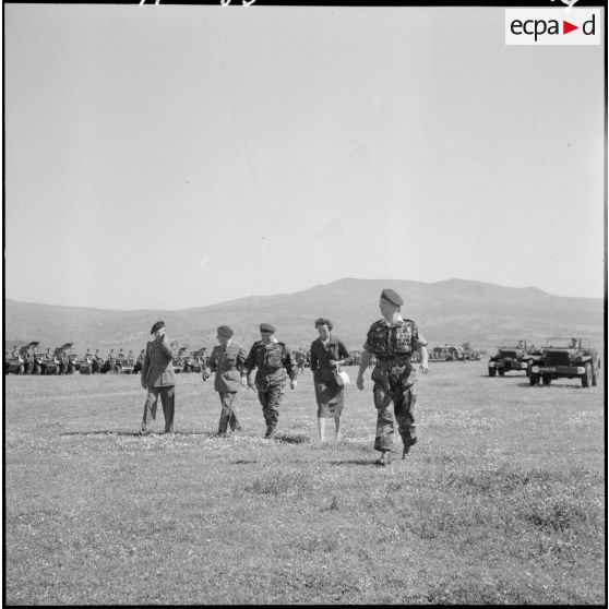 Azazga. Les généraux Gilles, Gracieux, Faure et la marraine du 13e régiment de dragons parachutistes (RDP) passent en revue les troupes.