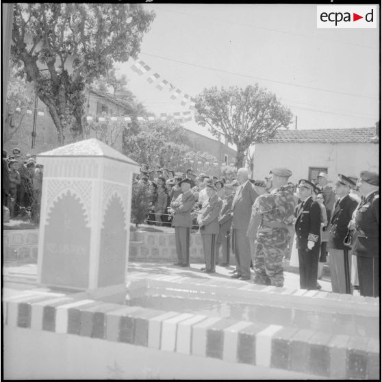 Azazga. La princesse Napoléon et les généraux Gilles et Faure déposent une gerbe de fleurs au monument aux morts.