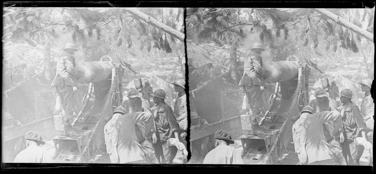 Chargement d'un canon de 155 mm long modèle 1877/1916, sur roues à cingoli.