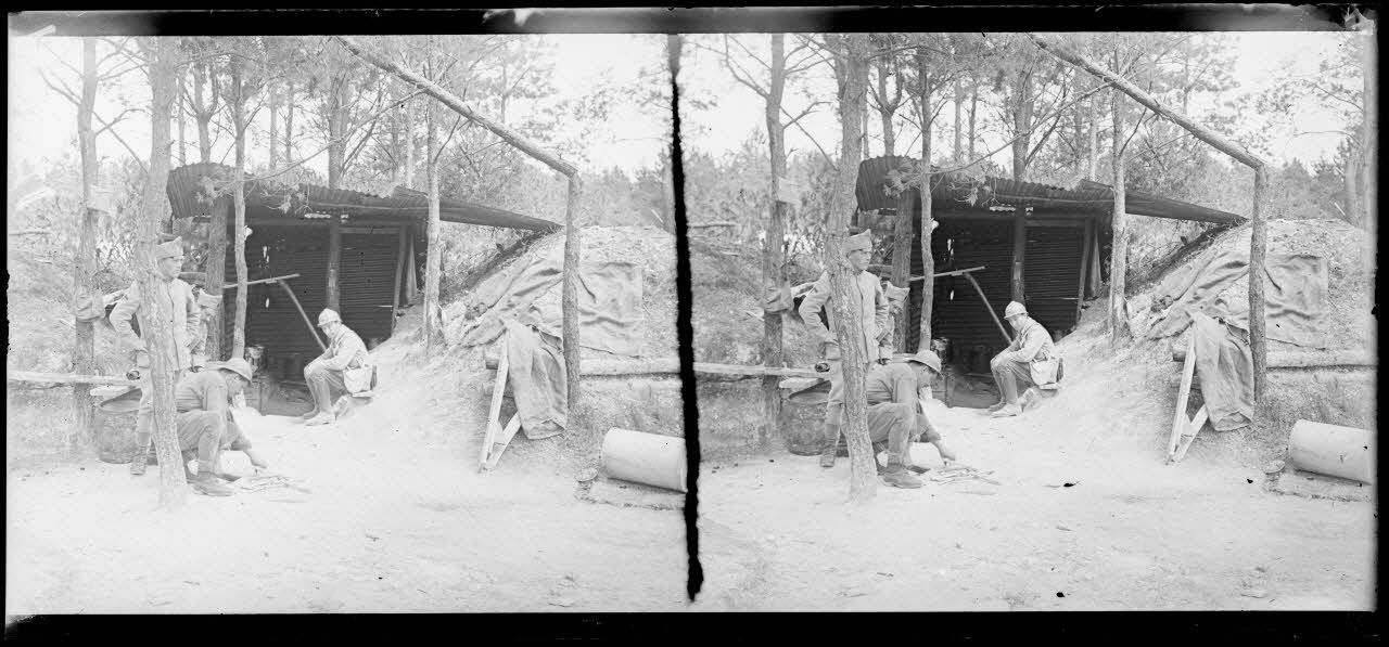 Baconnes (Marne). Ambulanciers américains à l'entrée de leur abri.