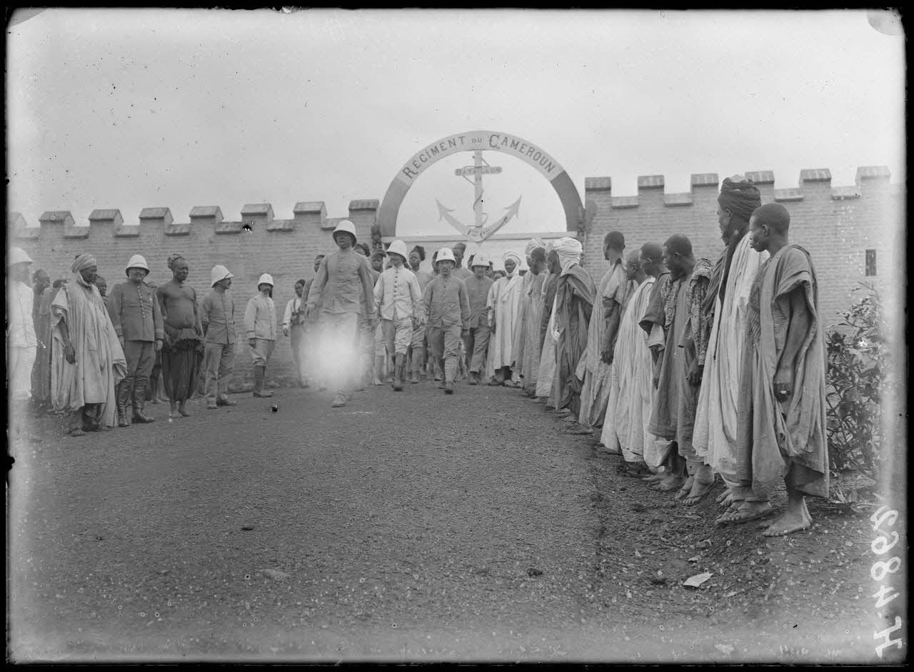 Après une séance du tribunal tenue au poste militaire de Bana, où est caserné le 1er bataillon du régiment de tirailleurs du Cameroun (1ere compagnie), les officiers sortent de l'enceinte entre deux rangées d'indigènes et de militaires.