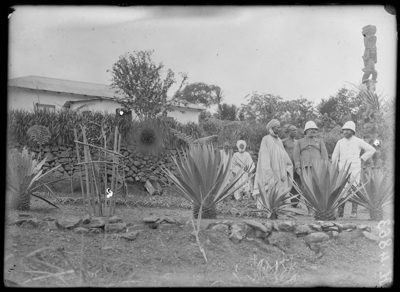 A Bana, un capitaine, un officier et quelques indigènes se tiennent dans le jardin en terrasses d'une maison, derrière des plantes tropicales et un totem.