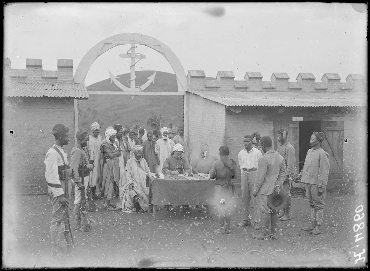 A la porte du poste militaire de Bana, un capitaine français préside une séance du tribunal de la circonscription. Deux tirailleurs, arme au pied, surveillent l'assistance.