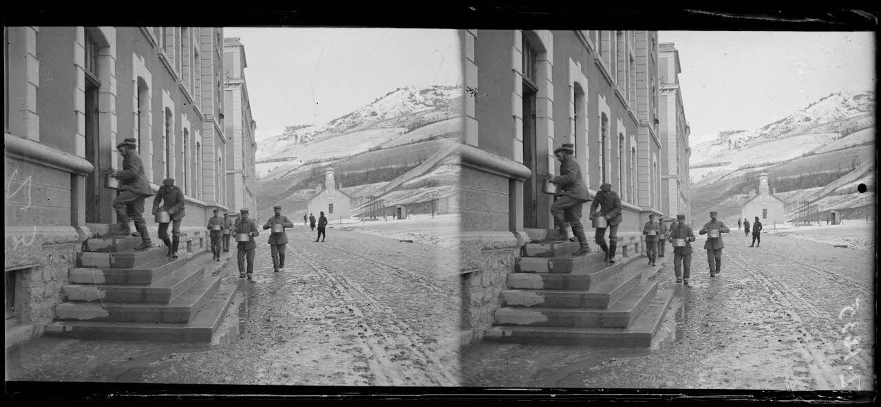Barcelonnette (Alpes de Haute Provence, 25/12/1915, Z 1143 à Z 1150) le jour de Noël, le dépôt des prisonniers de guerre allemands. (Z 1161 à Z 1162), Noël au dépôt de prisonniers ; l'opérateur signale sur sa fiche que la caserne de Barcelonnette est "du dernier modèle, tout le confort moderne, chauffage central, salle de bains etc. etc.".