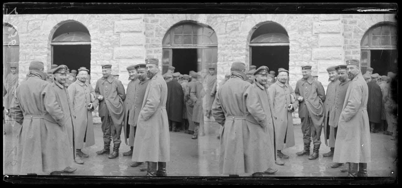 Barcelonnette (Alpes de Haute Provence, 25/12/1915, Z 1143 à Z 1150) le jour de Noël, le dépôt des prisonniers de guerre allemands. (Z 1161 à Z 1162), Noël au dépôt de prisonniers ; l'opérateur signale sur sa fiche que la caserne de Barcelonnette est "du dernier modèle, tout le confort moderne, chauffage central, salle de bains etc. etc.".