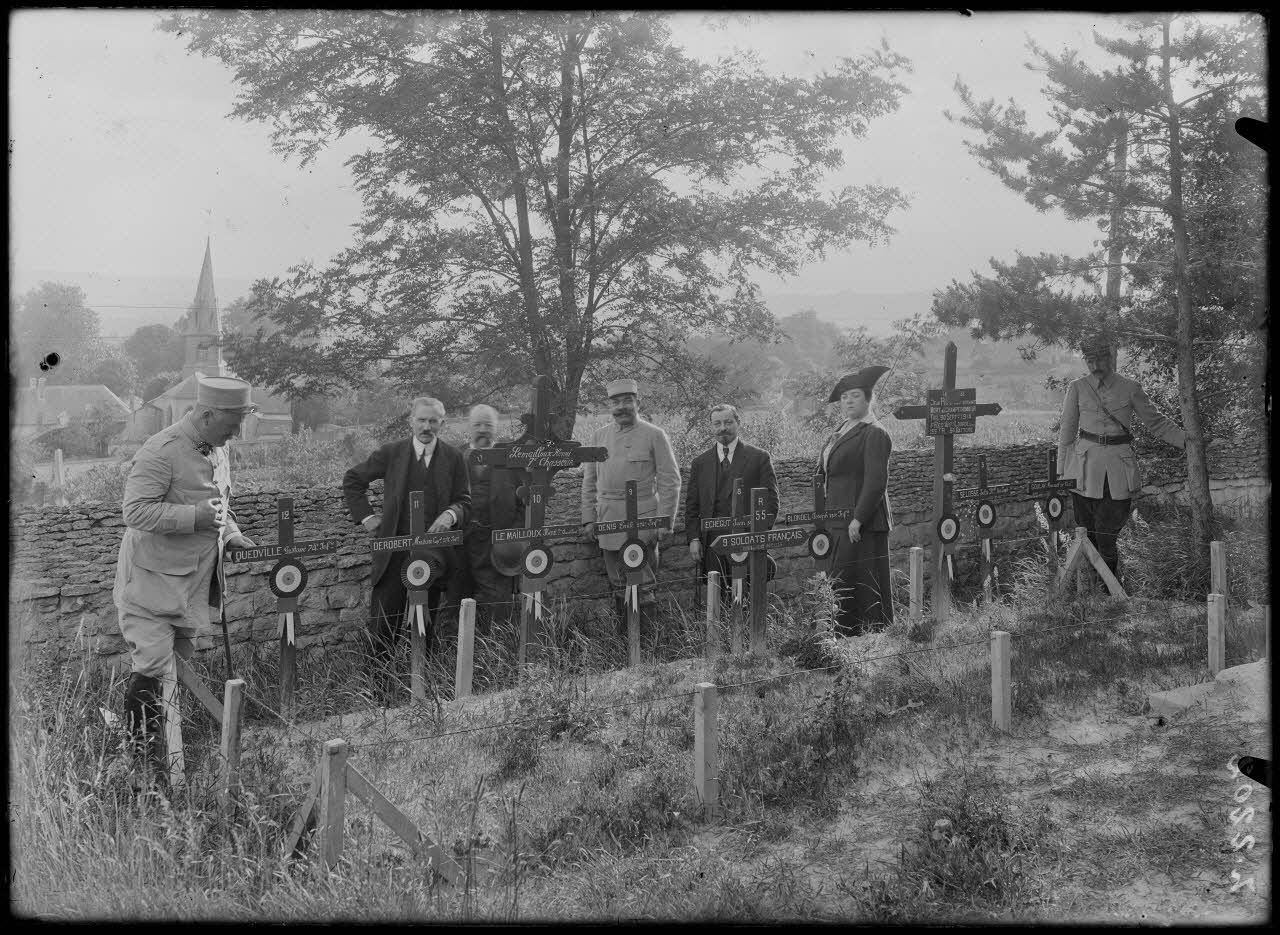Un groupe de civils et de militaire visite des cimetières où reposant des soldats tombés pendant la première bataille de la Marne. Au cimetière de Barcy, en Seine-et-Marne, ils sont photographiés à côté de la tombe collective de neuf Français : Quedville, Derobert, Le Mailloux, Denis, Echegut, Blondel, Selosse...