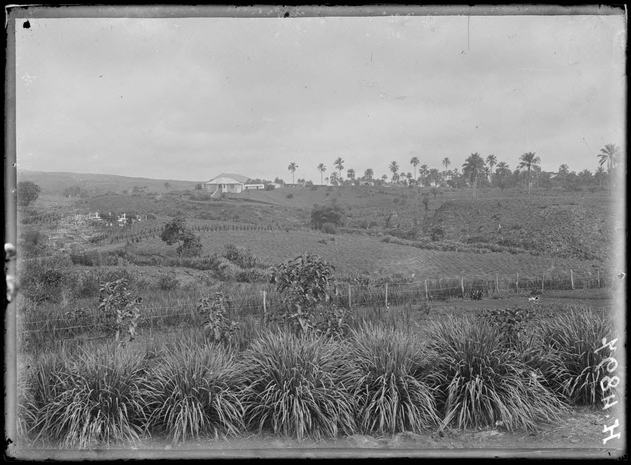 Depuis le village de Baré, au nord de Nkongsamba, vue des champs cultivés et d'une plantation vers le nord, où se trouvent également un cimetière et une maison.