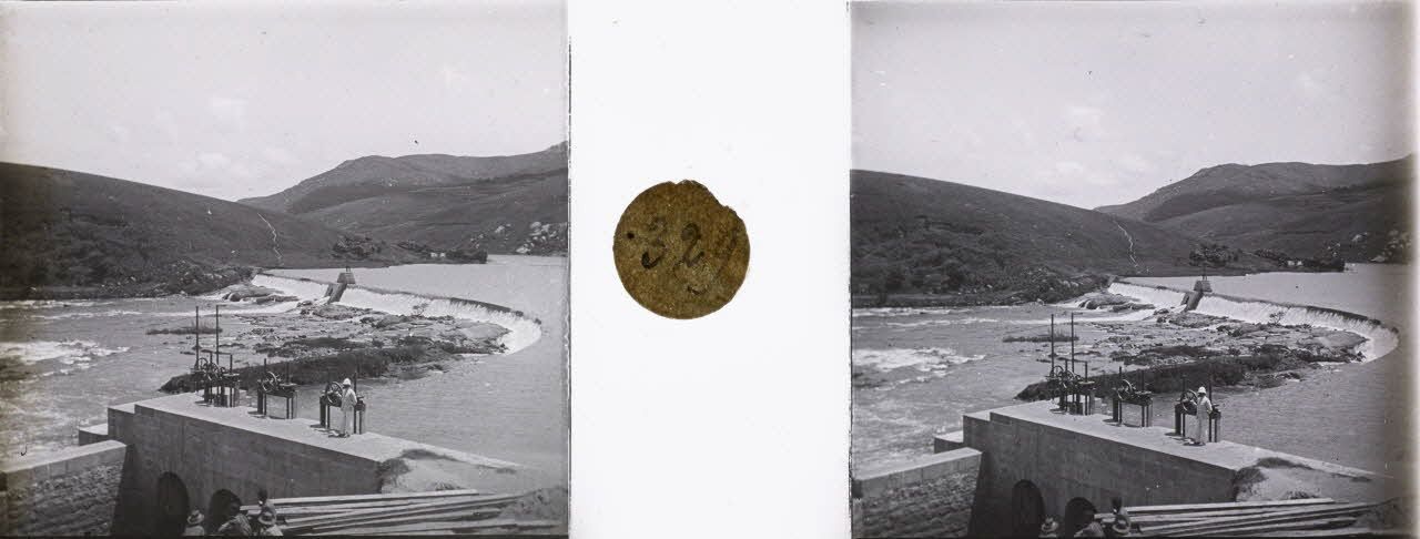 D68-32. René Denis photographie les paysages naturels malgaches lors de ses expéditions cartographiques dans la vallée de la Mandraka à l'est de Manjakandriana. Il circule alors avec deux tirailleurs et deux équipes de quatre bourjanes. Il photographie également le barrage d'Antelomito et son usine hydro-électrique.