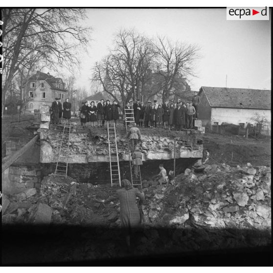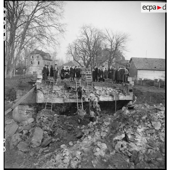 Le commandant Diebold et son état-major traversent la Thur à l'aide d'échelles (le pont étant détruit) et les habitants de Cernay les attendent avec impatience.