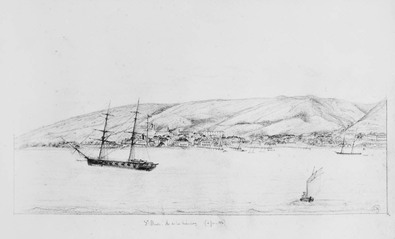 D39-1-3. Navire devant la ville de Saint-Denis de la Réunion, le 4 juin 1858. Signé en bas à droite.