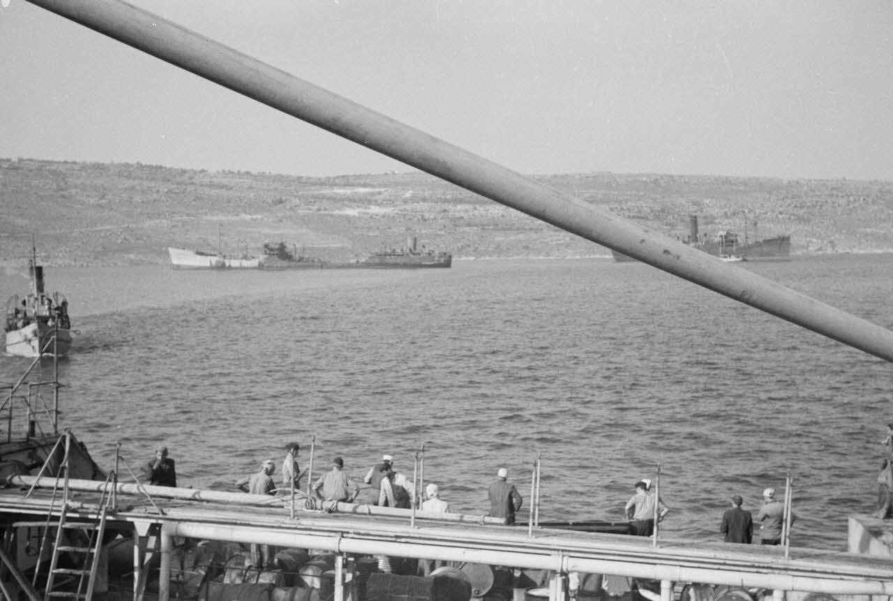 Dans la baie de la Sude (Souda Bay), le ravitaillement en pétrole d'un navire allemand.