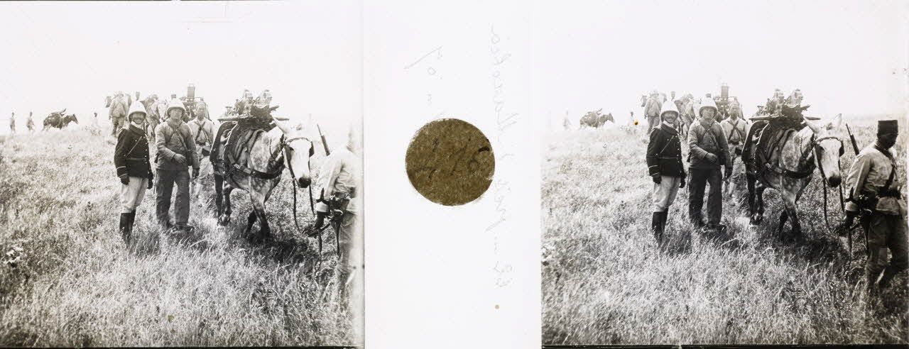 D68-42. Autour de Tananarive, les tirailleurs du 1er régiment de tirailleurs malgaches et les artilleurs de la 3e batterie du 7e régiment d'artillerie exécutent diverses manoeuvres. Ces évolutions sont destinées à apprécier la mobilité des batteries sur le terrain et à s'entraîner au tir. Le relief tourmenté, les cours d'eau et l'absence de routes praticables accentuent la difficulté des déploiements. Les rivières sont traversées à gué ou franchies sur d'étroites pirogues mises bout à bout. Deux types de canons de Bange de calibre de 80 mm sont alors utilisés : les canons de campagne, tirés par des attelages, et les canons de montagne, transportés en pièces détachées par des mulets. Les hommes sont équipés de mousquetons d'artillerie modèle 1892. Arrivés sur le champ de tir, les mulets sont déchargés et les pièces mises en batterie pour effectuer les exercices de tir.