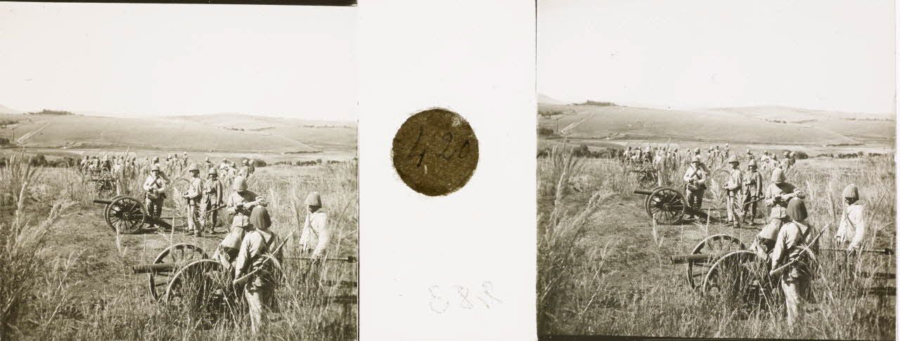 D68-42. Autour de Tananarive, les tirailleurs du 1er régiment de tirailleurs malgaches et les artilleurs de la 3e batterie du 7e régiment d'artillerie exécutent diverses manoeuvres. Ces évolutions sont destinées à apprécier la mobilité des batteries sur le terrain et à s'entraîner au tir. Le relief tourmenté, les cours d'eau et l'absence de routes praticables accentuent la difficulté des déploiements. Les rivières sont traversées à gué ou franchies sur d'étroites pirogues mises bout à bout. Deux types de canons de Bange de calibre de 80 mm sont alors utilisés : les canons de campagne, tirés par des attelages, et les canons de montagne, transportés en pièces détachées par des mulets. Les hommes sont équipés de mousquetons d'artillerie modèle 1892. Arrivés sur le champ de tir, les mulets sont déchargés et les pièces mises en batterie pour effectuer les exercices de tir.