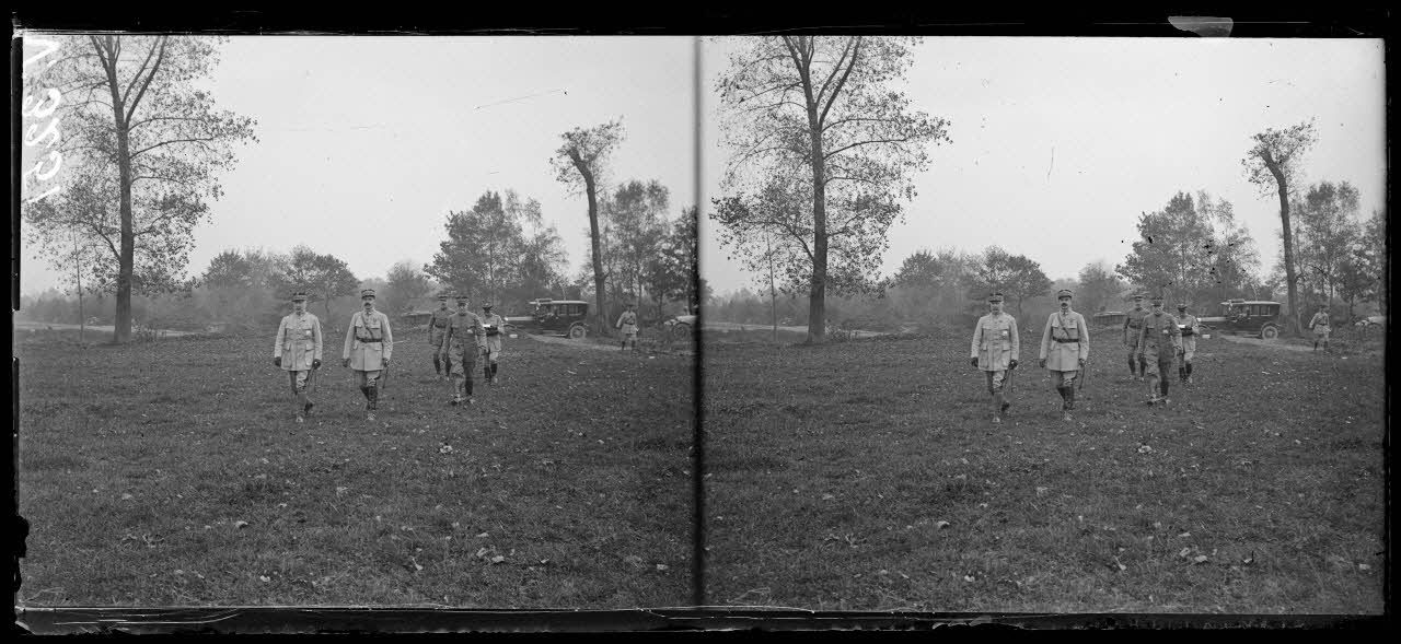 Beaulieu-lès-Fontaine, Oise, le général Pétain accompagné du général Fayolle, remet au général Debeney, la plaque de Grand officier de la Légion d'honneur. Les officiers attendant l'arrivée des généraux.