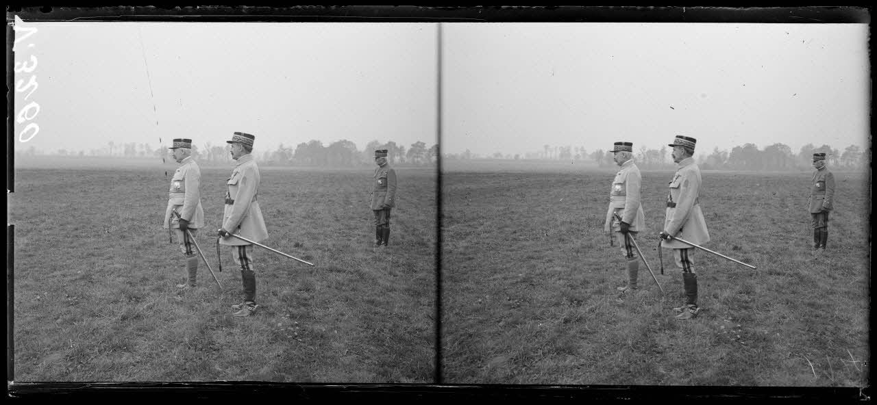 Beaulieu-lès-Fontaine, Oise, le général Pétain accompagné du général Fayolle, remet au général Debeney, la plaque de Grand officier de la Légion d'honneur. Lecture de la citation.